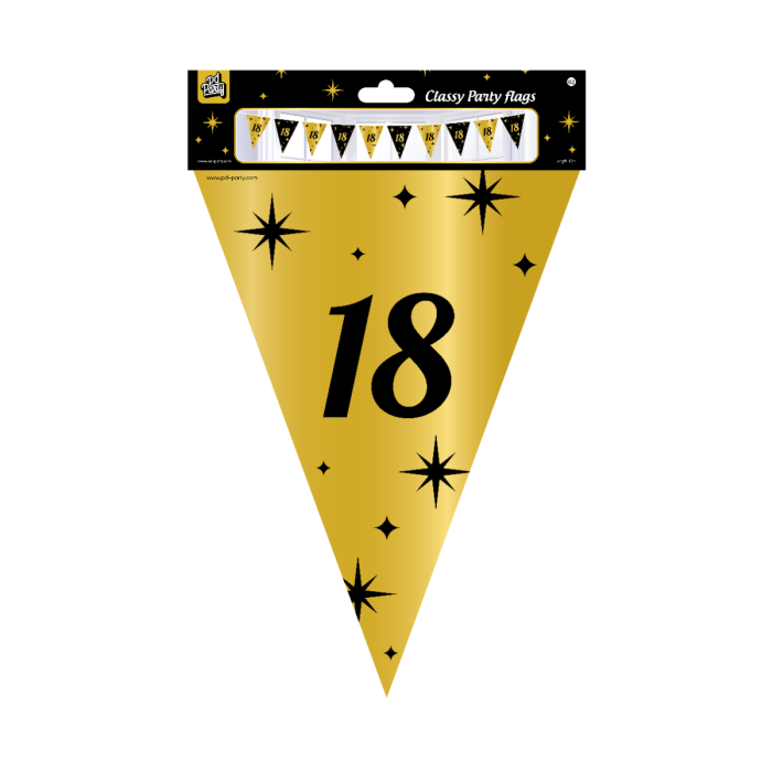 Maak van je 18e verjaardag een onvergetelijk feestje met deze stijlvolle folie-vlaggenlijn. Het glanzende zwart-gouden design zorgt voor een chique uitstraling, terwijl de 10 meter lange vlaggenlijn eenvoudig op te hangen is en direct een feestelijke sfeer creëert. Perfect om je verjaardag extra speciaal te maken