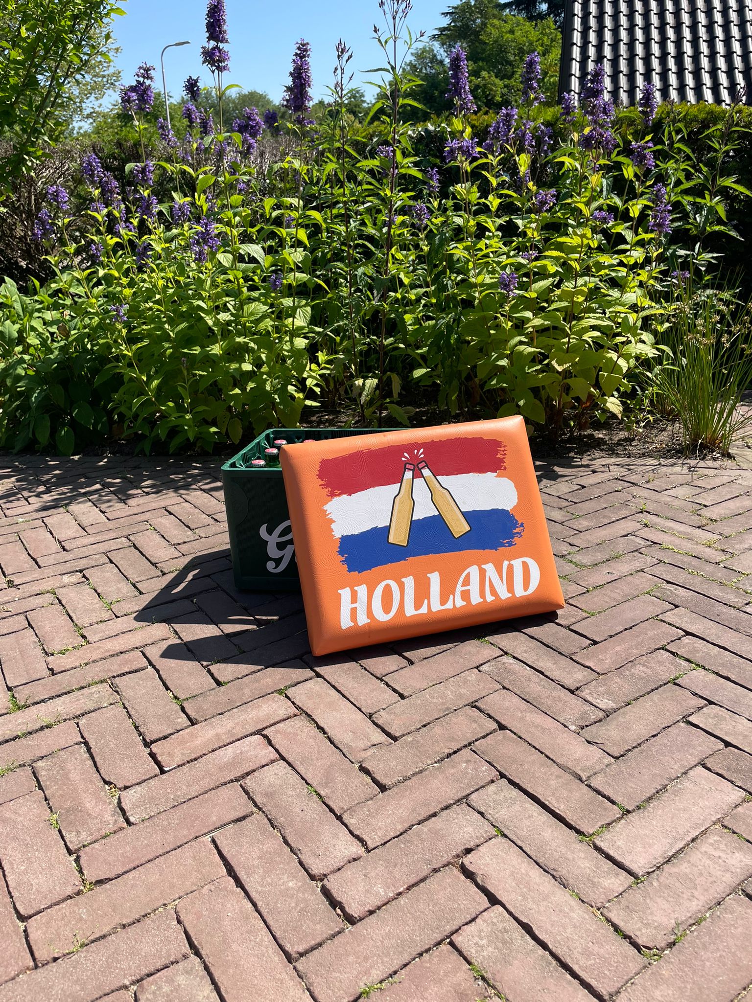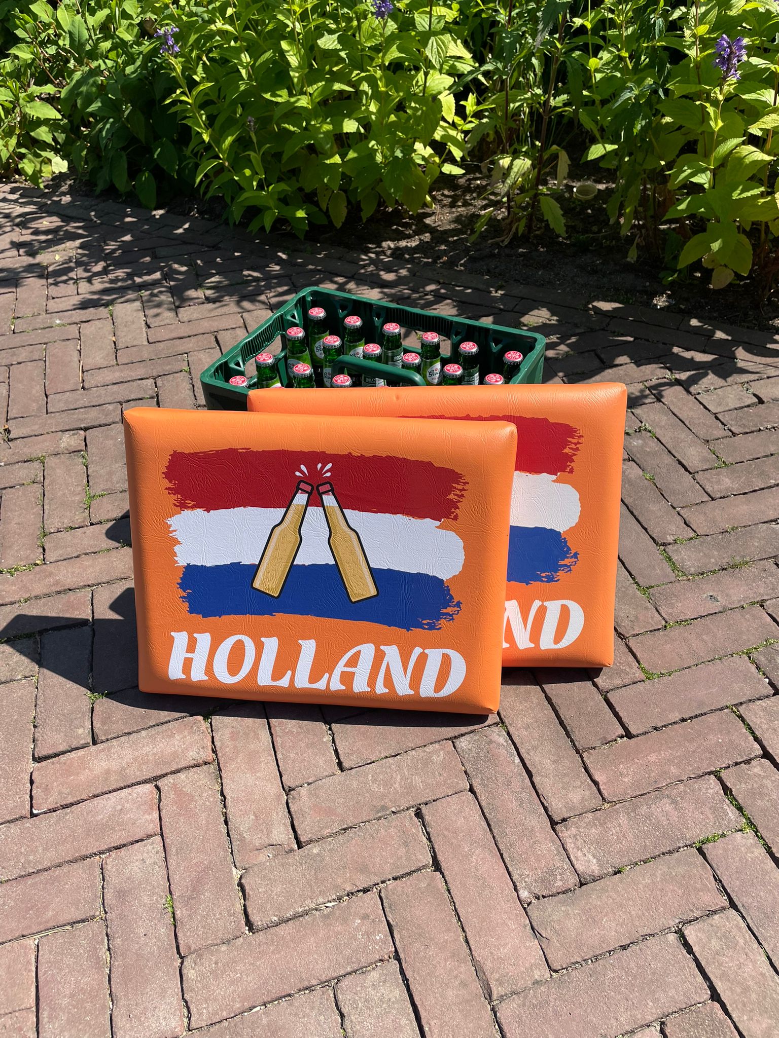 Dit zitkussen is speciaal ontworpen om perfect op een standaard bierkrat te passen. Dankzij de stevige schuimvulling zit je verrassend comfortabel – zelfs urenlang! De hoes is bedrukt met een vrolijke Holland-print: rood-wit-blauwe accenten, oranje flair en typisch Nederlandse symbolen.